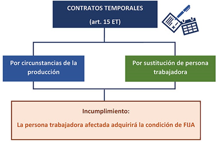 El empresario (o su departamento de recursos humanos) deberá tener a mano el calendario: las personas trabajadoras que en un periodo de veinticuatro meses hubieran estado contratadas durante un plazo superior a dieciocho meses, con o sin solución de continuidad, para el mismo o diferente puesto de trabajo con la misma empresa o grupo de empresas, mediante dos o más contratos por circunstancias de la producción, sea directamente o a través de su puesta a disposición por empresas de trabajo temporal, adquirirán la condición de personas trabajadoras fijas. Esta previsión también será de aplicación cuando se produzcan supuestos de sucesión o subrogación empresarial.