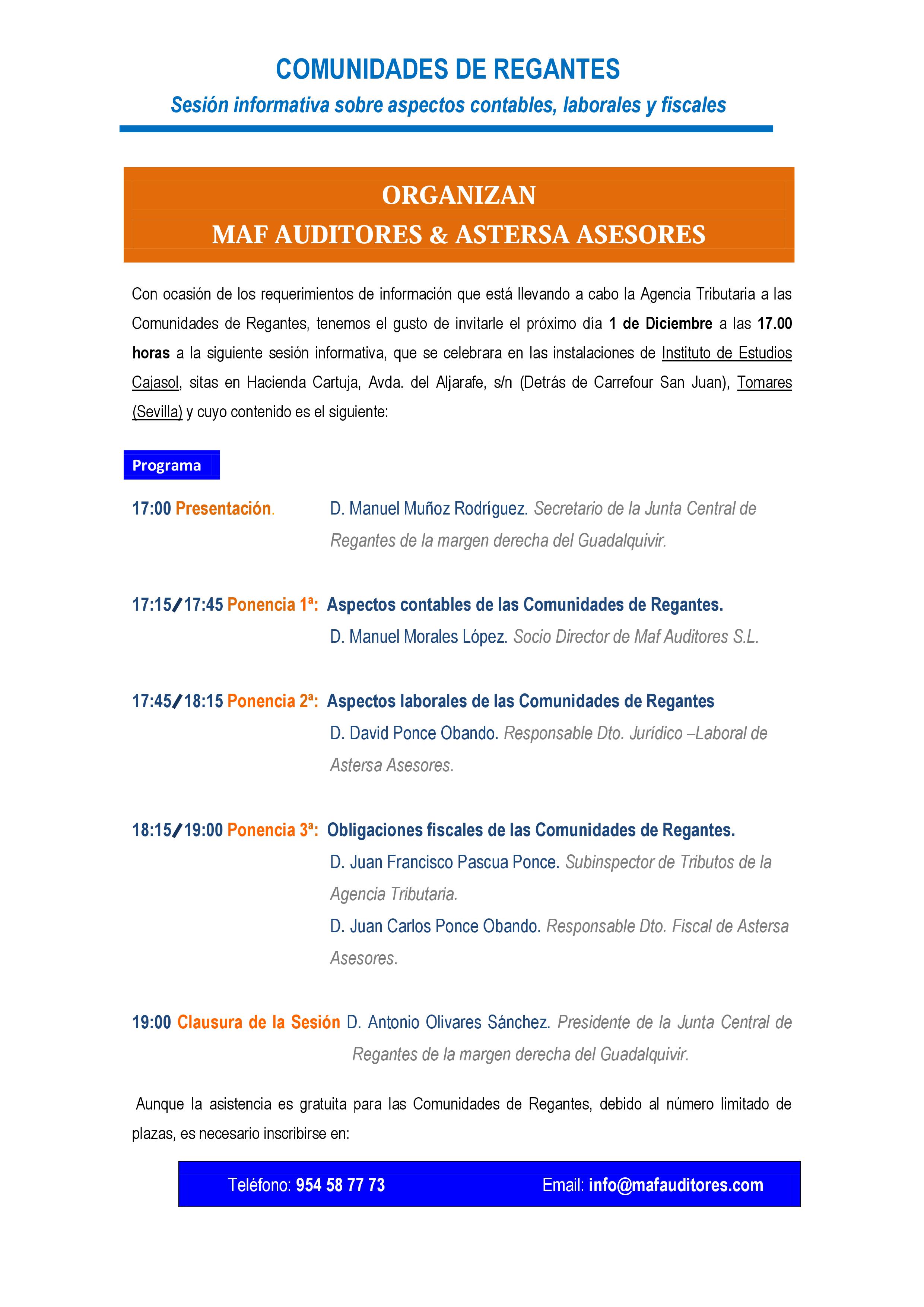 El próximo 1 de diciembre Astersa Asesores y Maf Auditores celebrarán una sesión informativa sobre los aspectos legales más relevantes de índole contable, fiscal y laboral, dirigida a las Comunidades de Regantes.